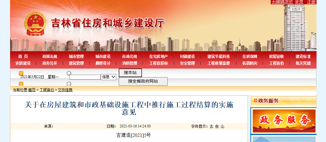 3月16日,吉林省住建廳發(fā)布《關于在房屋建筑和市政基礎設施工程中推行施工過程結算的實施意見》。施工合同工期一年(含一年)以上的房屋建筑和市政基礎設施工程,推行施工過程結算。鼓勵施工過程結算實行全過程造價咨詢服務:
