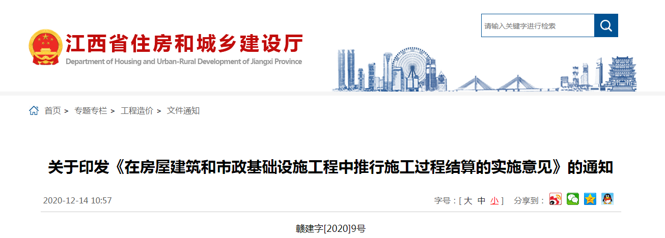 2020年12月14日,江西省住建廳發(fā)布通知,印發(fā)《在房屋建筑和市政基礎設施工程中推行施工過程結算的實施意見》,自下文之日起施行。