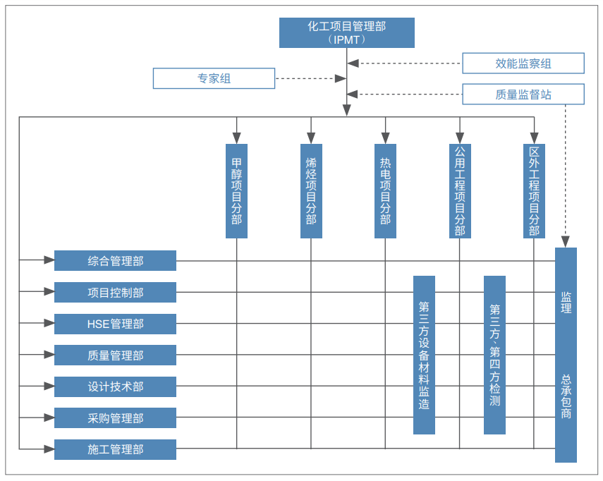 PMC的英文原意為項目管理承包/項目管理咨詢,在工程建設領域,PMC通常是指承擔工程項目管理承包/咨詢業務的項目管理公司,或是指業主對工程項目建設采取了項目管理承包/咨詢的模式。PMC作為一種工程項目建設組織管理模式,國際上最早出現于20世紀70年代中后期的中東地區,到20世紀90年代初,美國柏克德公司(BECHTEL)擔任“科威特戰后油田及煉油恢復項目”(簡稱“戰后修復工程”)的PMC承包商,這項巨型的國家戰后修復工程的完成,則是PMC作為一種工程項目管理模式成型的標志。此后,隨著PMC模式在世界各地工程建設中運用的增多,逐漸發展成為國際通行的工程建設項目管理模式之一。21世紀伊始,中國工程建設領域開始出現PMC模式。其早期標志主要有:2000年8月,投資約40億美元的南海石化項目發出PMC招標書。該項目業主(中國海洋石油公司和殼牌公司組建的合資公司)決定采用國際通行的PMC項目管理模式,由PMC承包商代表業主對工程建設全過程進行管理。這是中國首個采用PMC模式的工程項目。2003年3月,原建設部印發的《關于培育發展工程總承包和工程項目管理企業的指導意見》(建市[2003]30號)提出:“工程總承包和工程項目管理是國際通行的工程建設項目組織實施方式。積極推行工程總承包和工程項目管理……”這是我國首個給出“PMC”概念的部門規章。2004年1月,化學工業出版社出版《創建國際型項目管理公司和工程公司實用指南》,這是國內最早對PMC及項目管理公司進行完整描述的一本專著。近20年來,PMC模式被中海油、中石化、中石油、中國神華、中國中化等大型集團投資建設的一批大、中型項目所采用,取得了良好的工程建設效果,從而使PMC模式在我國工程建設領域得到了一定程度推廣。PMC模式是國際通行的現代工程建設項目管理模式,旨在規范、提升業主(建設單位)方的專業化工程項目管理水平。PMC模式是業主聘用專業化項目管理公司作為項目管理承包商代表業主或協助業主組織開展項目的工程建設活動,實施專業化、科學化的項目管理,以有效實現工程項目的各項建設目標。業主則以項目投資主體的身份,從建設目標、資金籌措、政府協調等整體上監督和控制整個項目,而不具體管理業主本身并非專長的一些項目管理內容。必要時,業主委托監理機構在PMC管理下對工程現場施工進行監理。IPMT(Integrated Project Management Team)是PMC的演變形式,中文意為“聯合項目管理組”,又稱“一體化項目管理團隊”,是指項目管理公司派出一批項目管理專業人員與業主的工程建設管理人員組成一體化項目管理團隊(IPMT),IPMT代表業主對項目建設全過程實施管理(圖1)。采用IPMT方式,一般是因為業主擁有一定的工程管理力量,但專業不全或不配套、項目管理體系不健全,業主通過引入項目管理公司,完善其項目管理體系,并對其有欠缺的專業管理進行“填平補齊”。