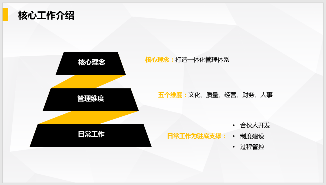 4、合伙人管理部:即將推進合伙人風控工作組工作,梳理總結,識別分析,從質量成果、檔案用印、財務管理、稅務籌劃等方面入手,加強安全合規管理。
