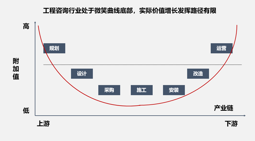 傳統工程咨詢處于微笑曲線底部,要實現價值增長需要咨詢業務“向前推進”、“向后延伸”。如傳統的全過程投控顧問服務,已經無法滿足客戶的需求,客戶迫切需要解決的是如何降低工程建設投資,如何做好概算控制,如何使項目增值等問題。
