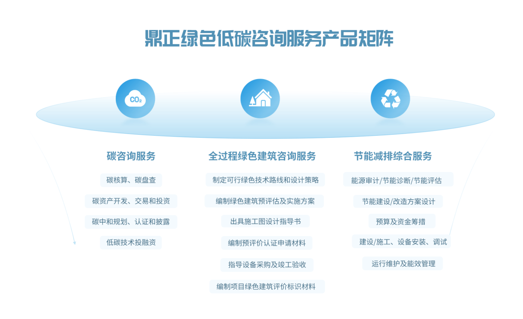 鼎故革新,正己守道。作為一家以創(chuàng)新驅(qū)動變革的工程咨詢企業(yè),我們密切關(guān)注國家前沿動態(tài),緊跟國家政策,不斷優(yōu)化產(chǎn)品結(jié)構(gòu)和服務(wù)模式。在“雙碳”目標(biāo)下,自2020起即針對工程領(lǐng)域的降碳、減排展開探索,協(xié)助政府統(tǒng)籌區(qū)域能源消耗,為碳指標(biāo)交易及資產(chǎn)管理、綠色金融、政策法規(guī)等方面的規(guī)劃作出指導(dǎo),這為孵化綠色低碳咨詢產(chǎn)品矩陣打下堅實的基礎(chǔ)。