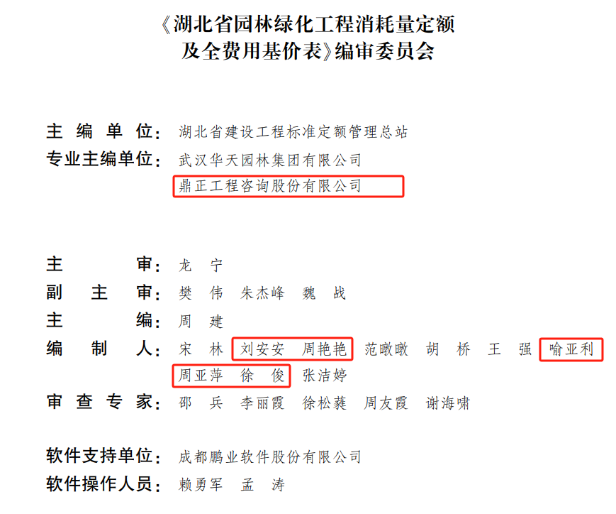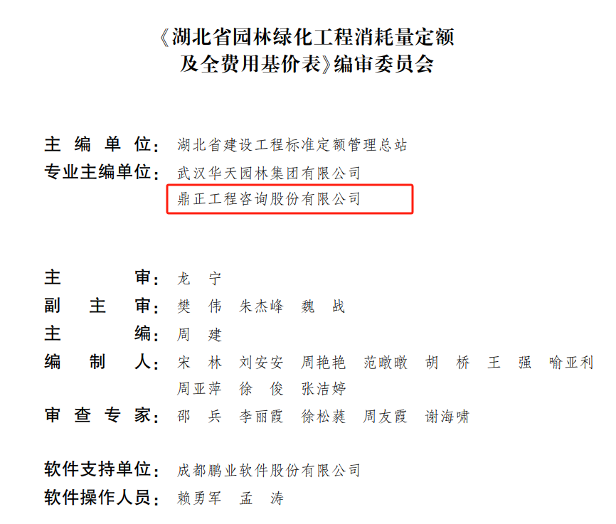 鼎正作為《湖北省園林綠化工程消耗量定額及全費用基價表》《湖北省建筑安裝工程費用定額》的參編單位之一,充分發(fā)揮全過程工程咨詢資源集中的優(yōu)勢,為此次定額的修訂貢獻(xiàn)了鼎正在全過程工程咨詢、工程造價咨詢業(yè)務(wù)領(lǐng)域編審設(shè)計概算、投資估算、工程預(yù)算、過程結(jié)算、竣工結(jié)算等實踐經(jīng)驗,對進(jìn)一步完善工程造價計價依據(jù)體系提供了有力的技術(shù)支撐。