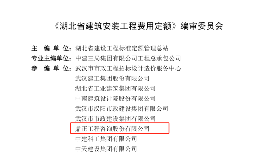 鼎正高度重視標(biāo)準(zhǔn)化工作,多次參與國家、地方及行業(yè)標(biāo)準(zhǔn)編制。此次參與《湖北省建筑安裝工程費用定額》《湖北省建筑安裝工程費用定額》的定額編制,既是鼎正多年堅持多年各咨詢板塊專業(yè)化沉淀和發(fā)展的集中體現(xiàn),更是鼎正履行推動行業(yè)進(jìn)步、規(guī)范建設(shè)市場行為的專業(yè)職責(zé)所在。下一步,鼎正將繼續(xù)發(fā)揮專業(yè)優(yōu)勢,集結(jié)公司更多骨干專家力量,為提升行業(yè)整體標(biāo)準(zhǔn)化水平、促進(jìn)行業(yè)的高質(zhì)量發(fā)展貢獻(xiàn)專業(yè)力量。