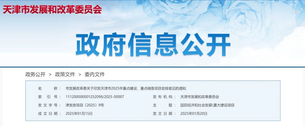 天津市發(fā)展改革委發(fā)布2025年重點(diǎn)建設(shè)、重點(diǎn)儲備項(xiàng)目安排意見,共計(jì)1129個(gè)項(xiàng)目、總投資2.02萬億元。其中,包括重點(diǎn)建設(shè)項(xiàng)目854個(gè),總投資1.52萬億元,年度計(jì)劃投資2209.07億元,均為在建續(xù)建或即將開工項(xiàng)目;重點(diǎn)儲備項(xiàng)目275個(gè),總投資4992.26億元。