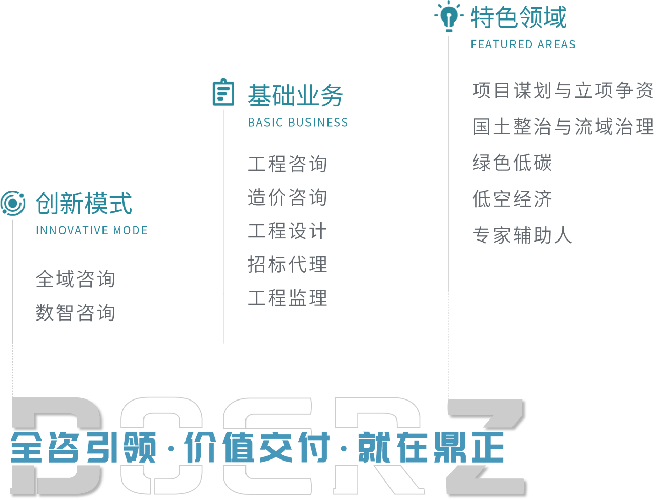 服務版圖:縱向貫通"投融資-規劃-設計-招標-監理-運維"全周期鏈條,橫向覆蓋基建、民生、生態、鄉村振興等關鍵領域,構建"基礎+特色+創新"三維服務體系,能為客戶提供全方位、多層次的綜合解決方案。